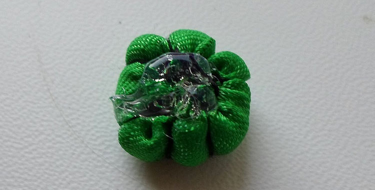 Пока тычинки будут высыхать, приступим к созданию маковой коробочки. Для этого возьмем зеленую ленты и вырежем из нее небольшой круг.