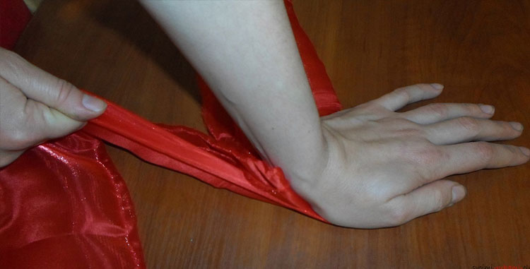 Теперь левой рукой прижимаем органзу с лепестком к столу, а другой край ткани сильно натягиваем правой рукой и, не попуская нажима левой руки, выкручиваем органзу по часовой стрелке.